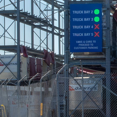 With four loading bays, it was not uncommon for all to be occupied on a regular basis. Problems would arise when additional trucks would arrive to find no bay available and left with no space to turn around or allow another truck to depart. To date, manpower has been used to manage congestion and bay usage, with two traffic controllers on duty 24 hours a day, 7 days a week. Now, using signage and technology, Park Agility have assisted QANTAS Freight with an automated solution that will save time and money.