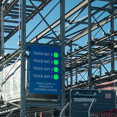 Each of the four bays are monitored with inductive loops, with three per bay set in specific locations to allow the system to determine the length of the vehicle. Data from these loops is sent to two separate signs, located on approach to the loading dock and at the loading dock.